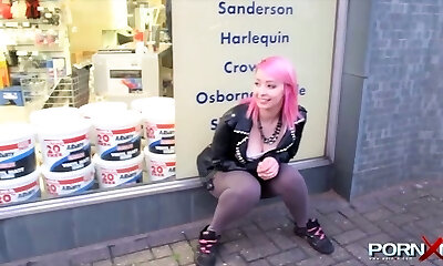 Kinky pink haired emo girlie in taut yoga pants pisses outdoors for dude