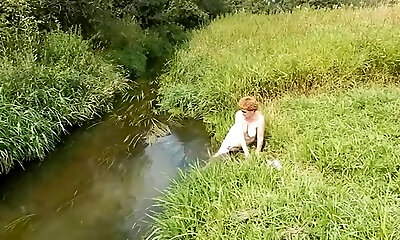 Sexy bright babe with bright red hair strips and showcases tits in the woods