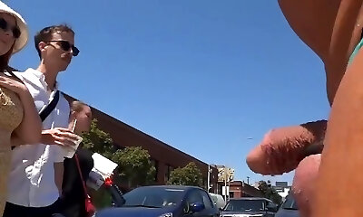 Sexy shemale exhibitionist strokes monstrous uncut cock on beach