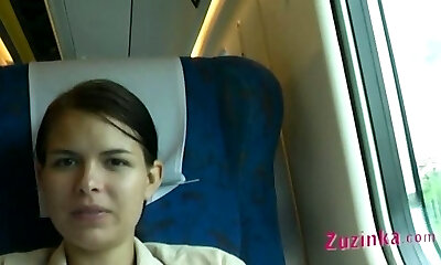 Shameless bitch Zuzinka demonstrates her shaved pussy in the train