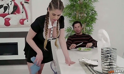 Hot buxom maid with big boobs gets plumbed in the kitchen by her client