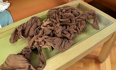 Scorching brunette takes off her pantyhose